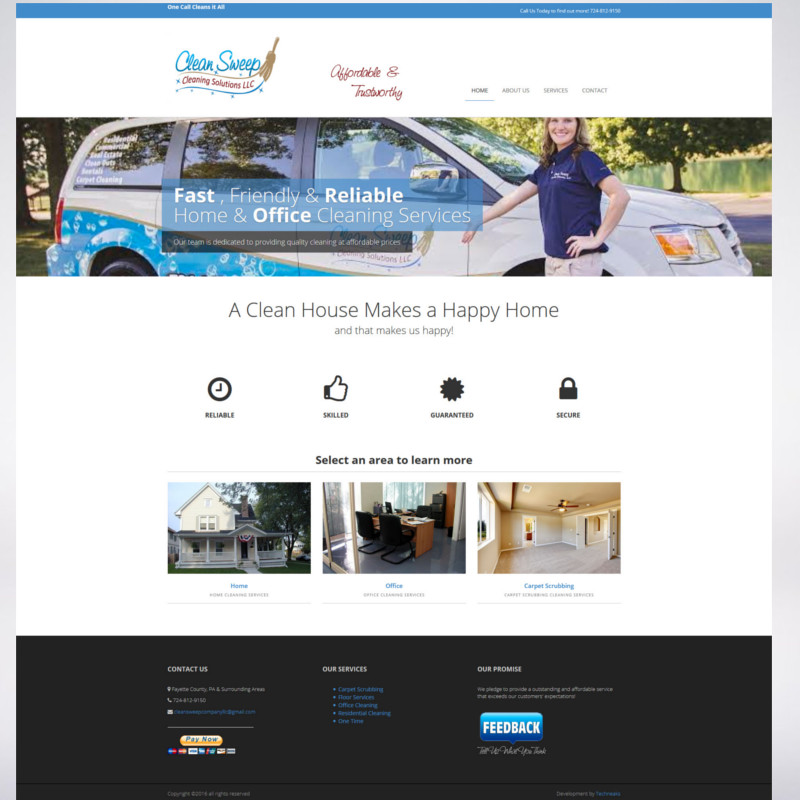 Clean Sweep Cleaning Solutions contacted me for assistance in developing their on line presence. At the time, they were a newer company without any branding or website. I was able to work with the owner and create an all inclusive package to get Clean Sweep up and running with a professional website. The first part of the project was creating a company logo that would be used throughout the rest of the project. With the help from the owner of Clean Sweep, We were able to quickly mock up a few designs and agree on a concept. Only a few short days later I was able to provide a high resolution vector logo that met their needs and wants. This logo is now being used not only on the company website, but also wrapped on their company vehicles, and on the custom business cards I designed. The website provided to Clean Sweep turned out great! We were able to convey the services offered in a quick and clean method. Per request, we also added in a client feedback section and a link to their P ay Pal account for payments. Stephanie's vision and aspiration made this project a huge success, and I look forward to the opportunity of providing on line marketing services in the future.