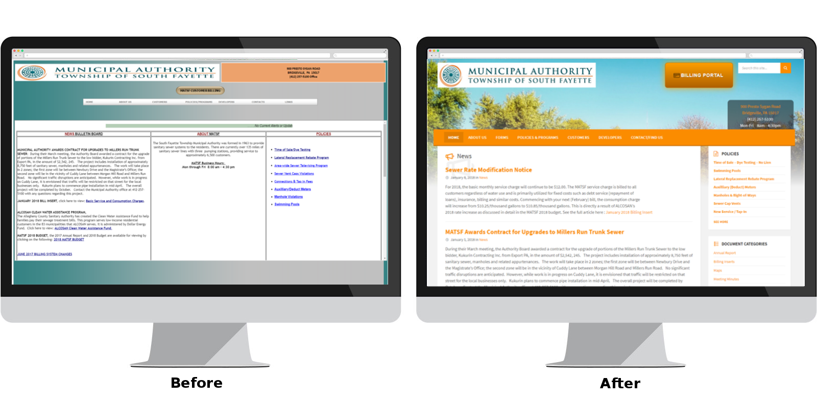 The municipal authority of South Fayette (MATSF) contacted me original to provide a quote to provide on-going maintenance for their existing website. The client has regular content updates that need to be added to the site. At the time of contacting me, the clien thad an outdated website which was not responsive to different screen sizes and was difficult to navigate. After discussions, we have decided a complete website overhaul would be the best approach. I was able to deliver MATSF a website that would allow users to easily navigate the website on all devices including cell phones and tablets. Most importantly they were provided a website that utilizes a content managment system (CMS) backend which will allow for easy updating and additions in the future.
